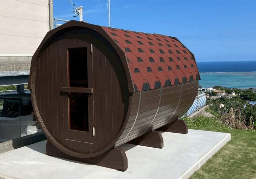 沖縄県南城市の高台に位置する宿に、SaunaPlaceのバレルサウナ(半月窓付き)1800×2400mmを導入いただきました。