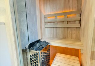 設計士様と協議し、屋内用サウナ1800×1800に囲いをし、共に間接照明でムーディな雰囲気を演出しました。