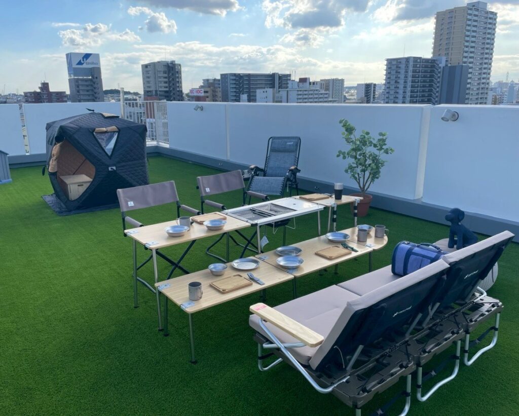 人工芝が広がる開放的なルーフトップにテントサウナを設置し、都市景観を望みながらアウトドアサウナを楽しめる空間を演出。