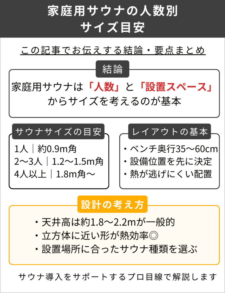 家庭用サウナを設置する際、設置スペースや人数に合わせたサイズやレイアウトのコツがわかると、計画がぐっと進みやすくなります!