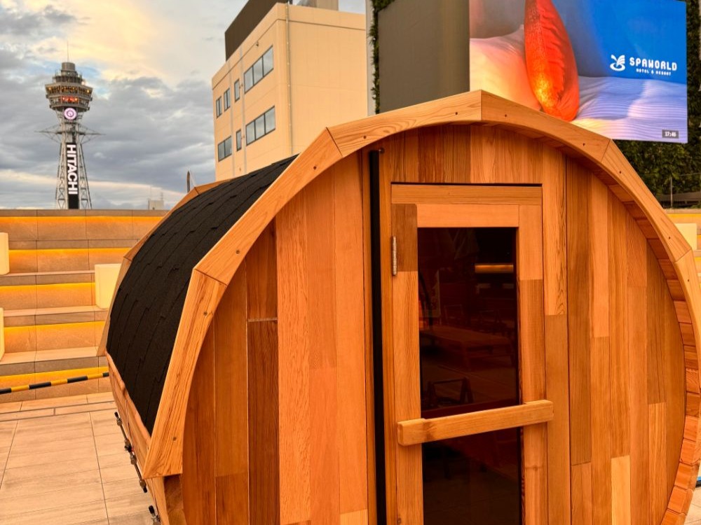大阪の屋上に設置した弊社施工のバレルサウナでは、サウナに入りながら通天閣を望む特別な景観が楽しめます。