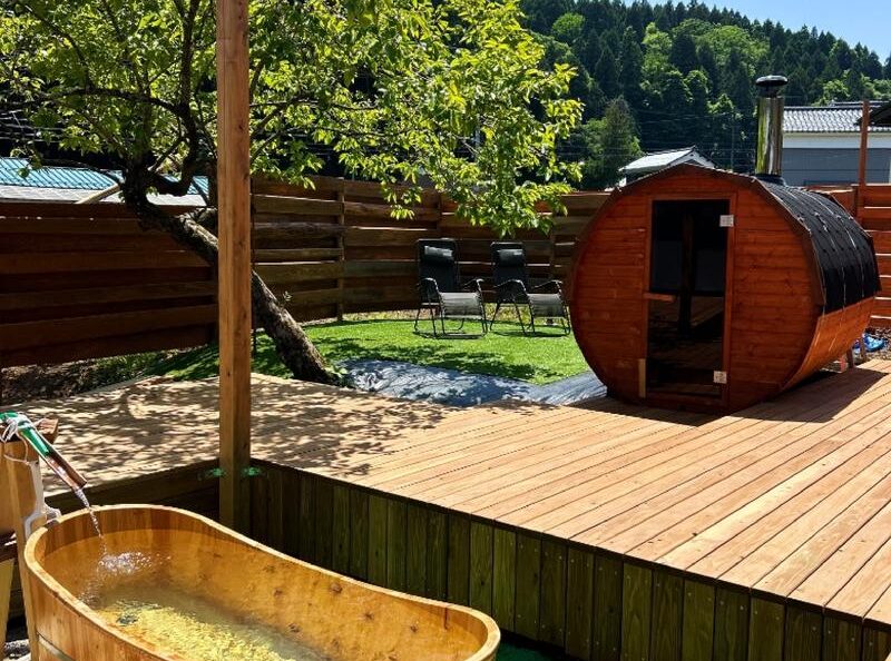 古民家に作られた広いウッドデッキに6人ほどが入れるバレルサウナがありますよ。