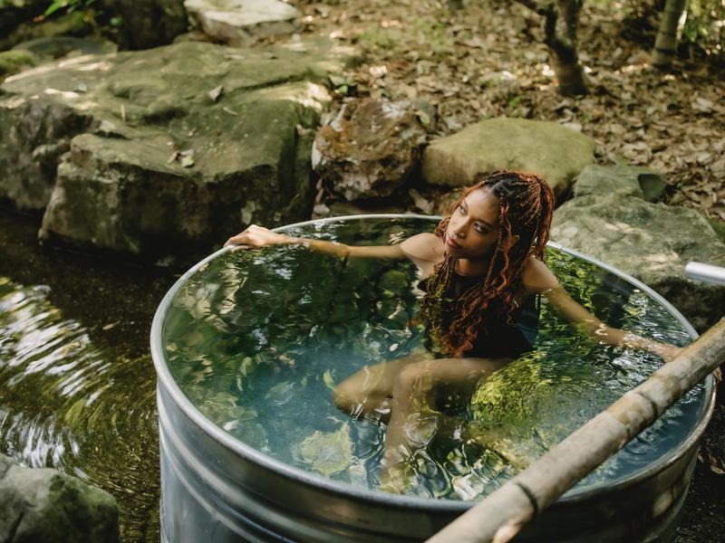 阿多古川の川辺にテントサウナが設営されており、冷水浴はそのまま透き通った冷たい川に入れます。
