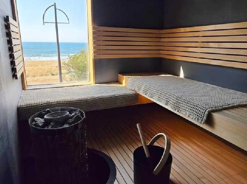 サウナ室は4人ほど入れる広さがあり、大きな窓から海が見えます。