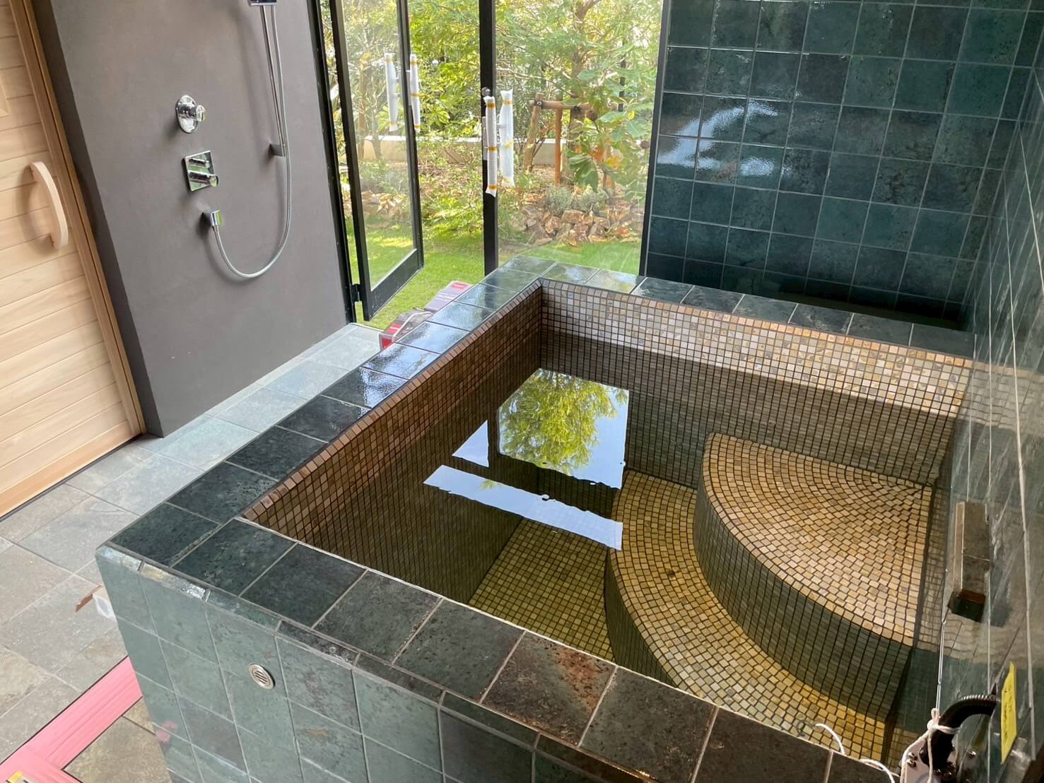 造作浴槽に水風呂チラーシステムを導入。自動給水で水量制御。