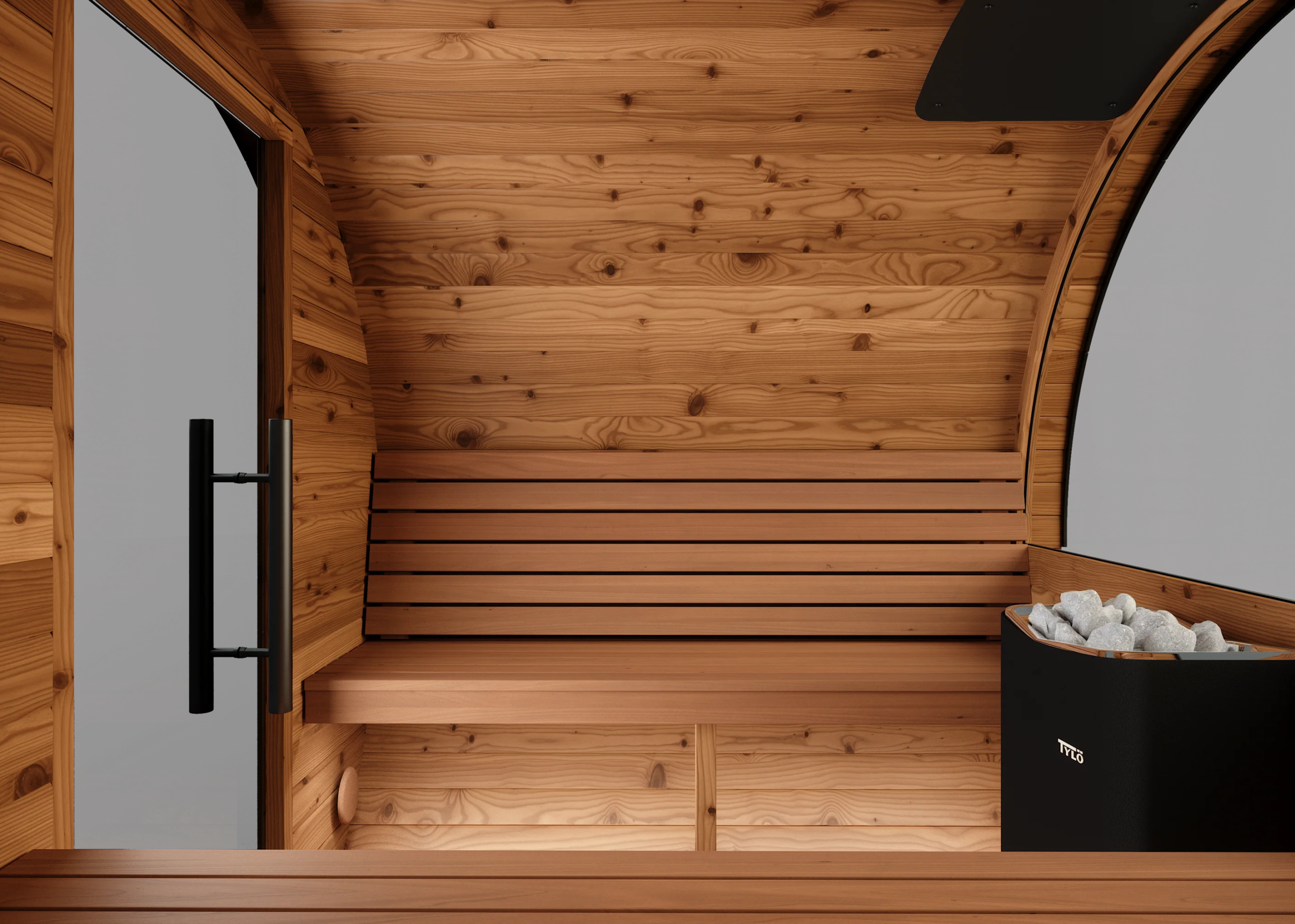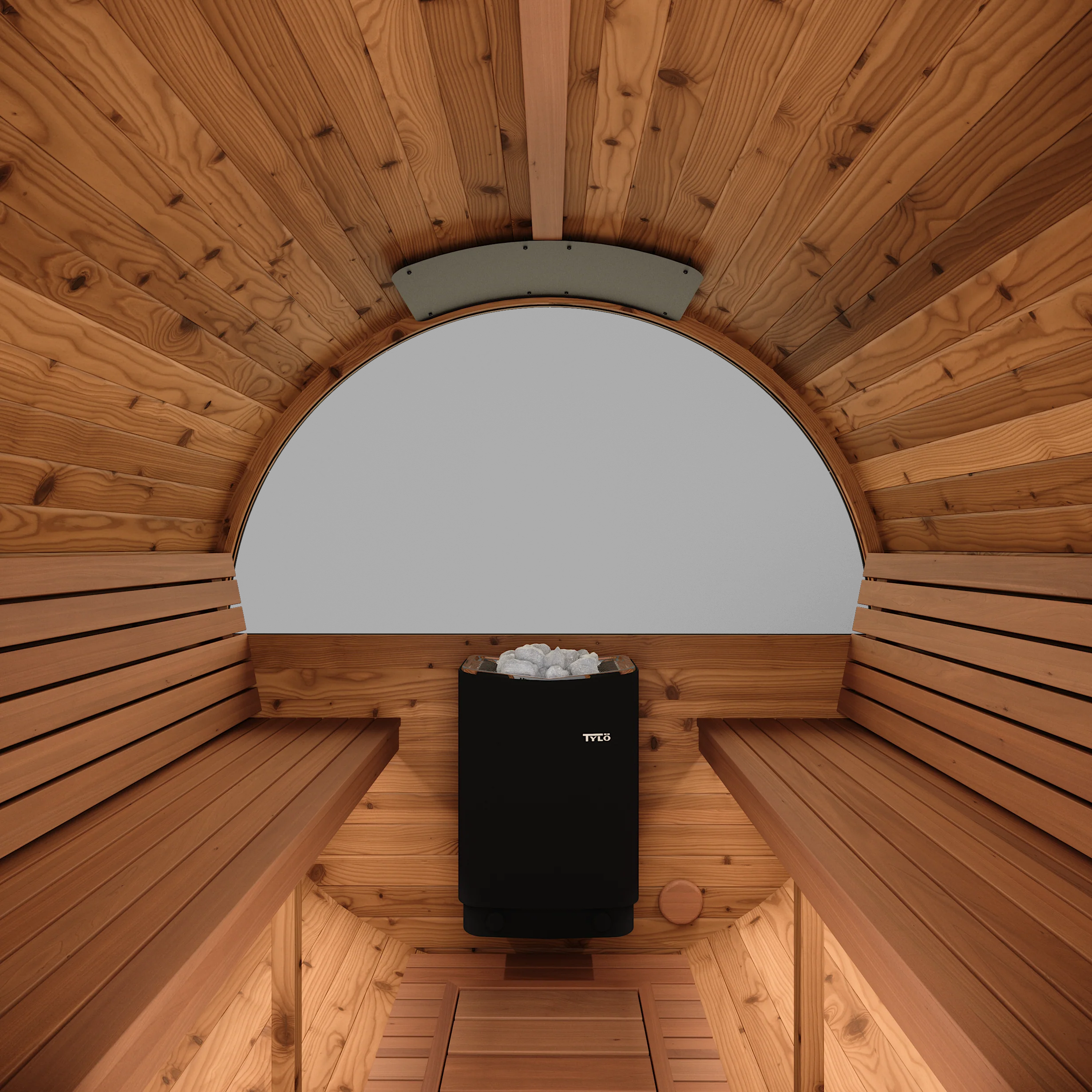 バレルサウナを満喫するためのオプションが備わったスタンダードモデルの最大の特徴はパノラマガラス。最高110度にも至るサウナの中から、半円状のガラスを通してみる景色は格別です。totonoüの製品の中でも最も人気なオプションを集めたモデルとなっています。家庭用・業務用双方でご活用いただけるサウナです。