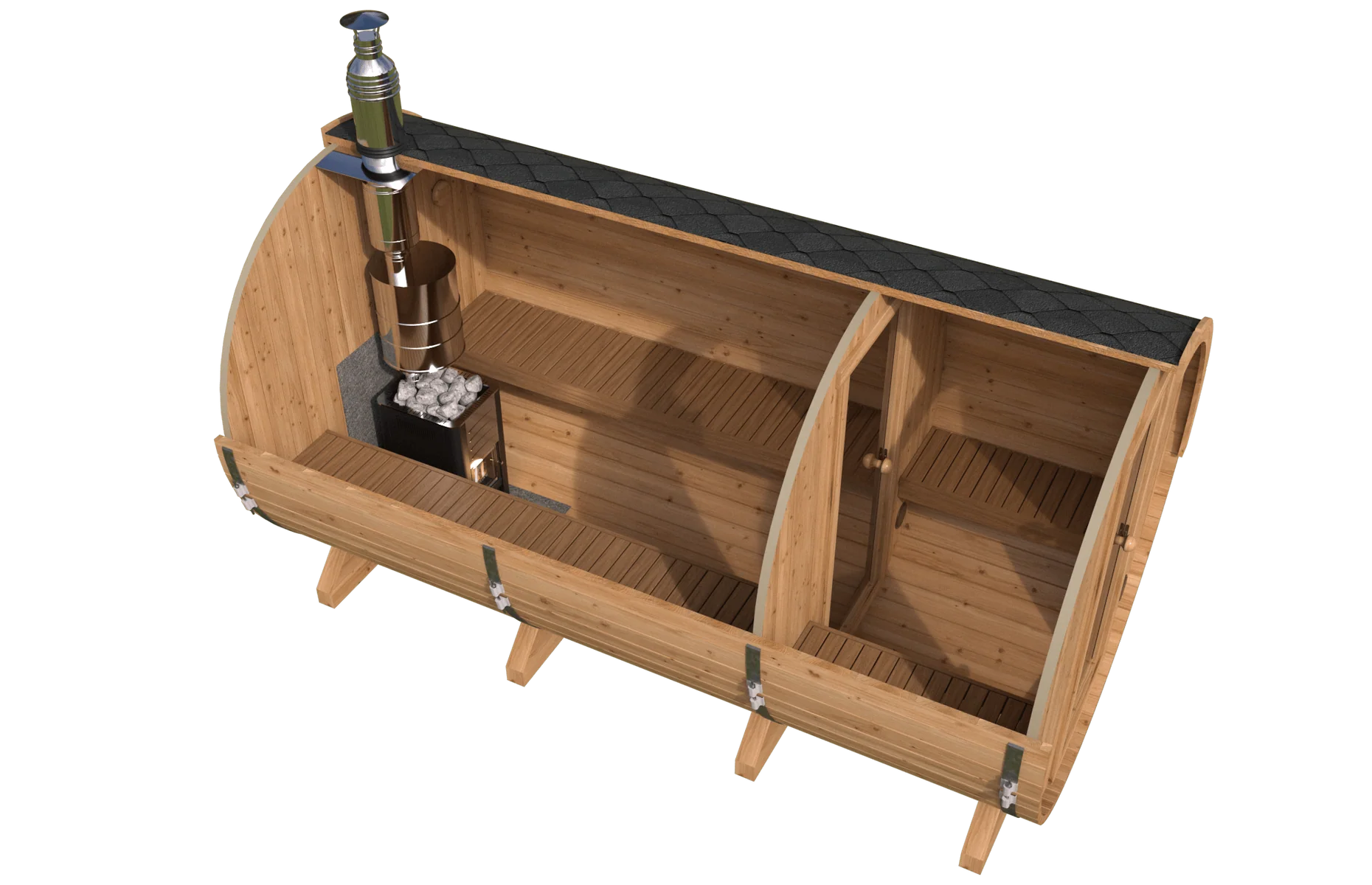 バレル(樽)型のデザインは熱の循環効率が高く、短時間で室内を温められるのが特長です。見た目にもおしゃれで、設置も比較的簡単なため、個人宅や別荘に人気があります。木の香りや温もりを感じられる点も魅力です。