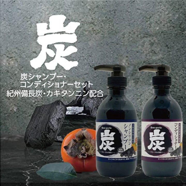 ボン・ペルル 炭シャンプー・コンディショナーセット 550g・530ml ノンシリコン 毛穴汚れ 防臭 備長炭 カキタニン配合