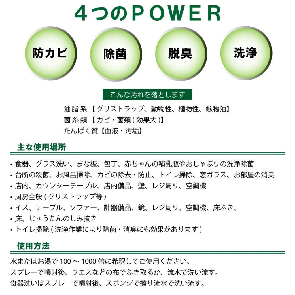 4つのパワー【脱臭・防カビ・洗浄・除菌】で食器洗い、台所の殺菌、お風呂掃除、トイレ掃除、窓ガラス、床ふき、カビの除去・防止、お部屋の消臭など多様なシーンでご使用いただける洗剤です。