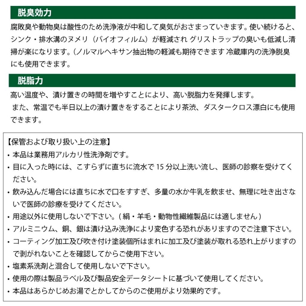 油系(グリストラップ・動物性・植物性・鉱物油)、菌糸類(血液・汚垢)、たんぱく質(カビ、菌類)などの汚れを落とします。