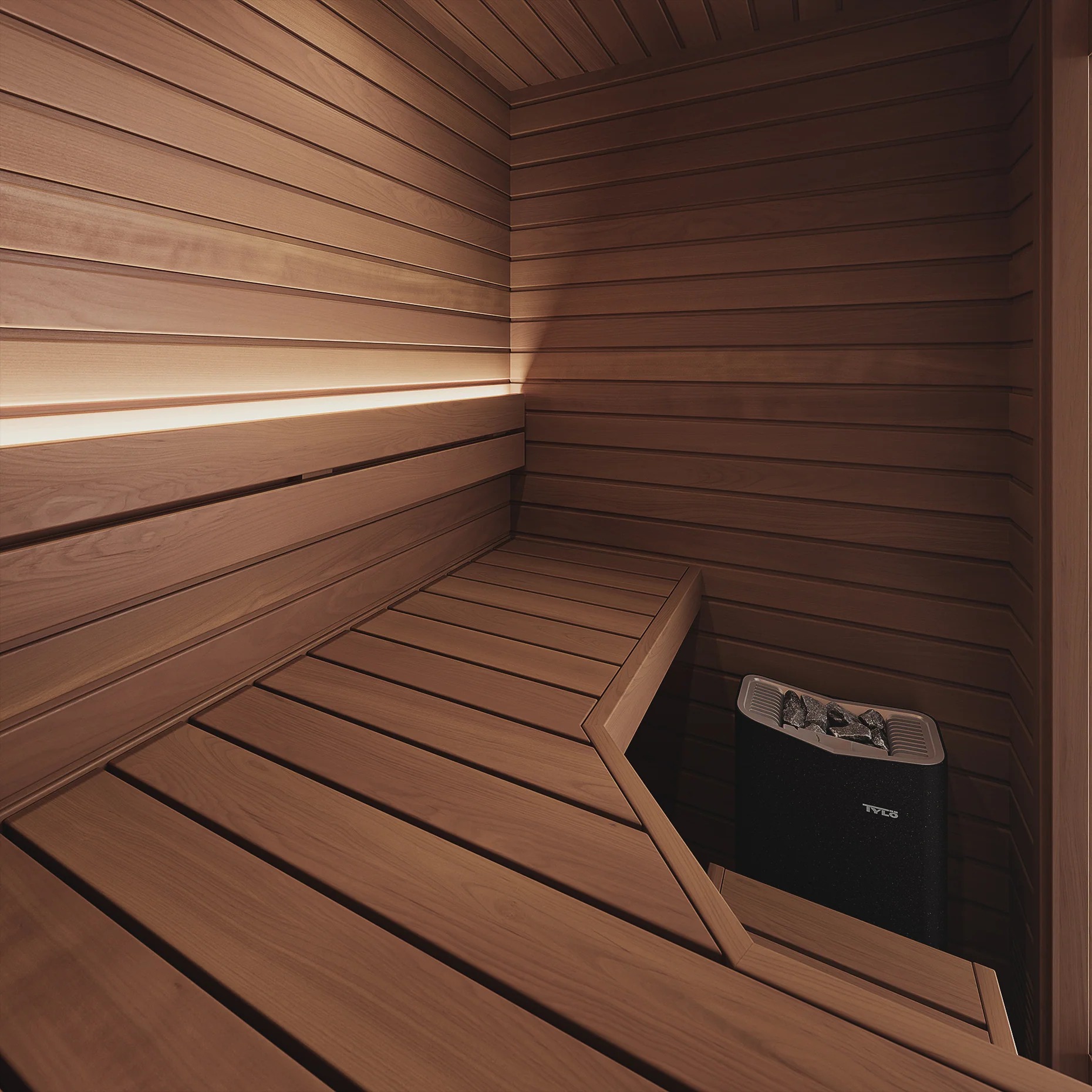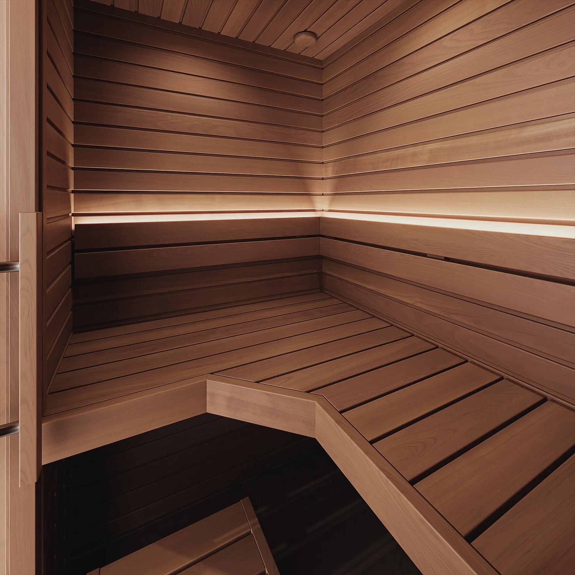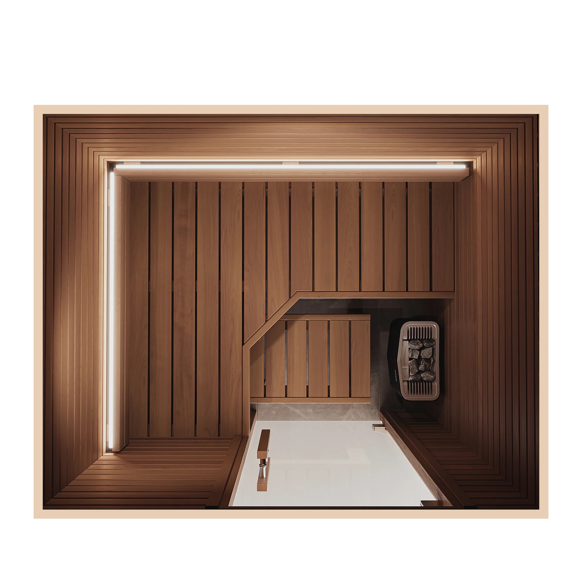 木製パネルと耐熱強化ガラスのドアを組み合わせた構造によって、高いデザイン性と保温性を両立。スイッチを入れてからわずか15〜25分ほどで室温は90度近くに達し、すぐに本格的なサウナに入ることができます。