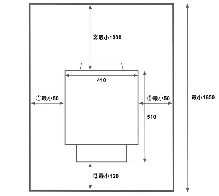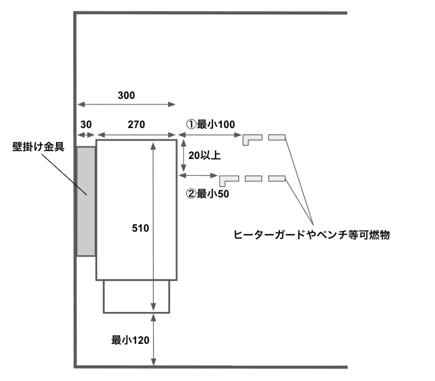 - ストーブ上端よりも20mm以上低い位置の場合、可燃物/不燃物との最低離隔距離は最小50mm確保