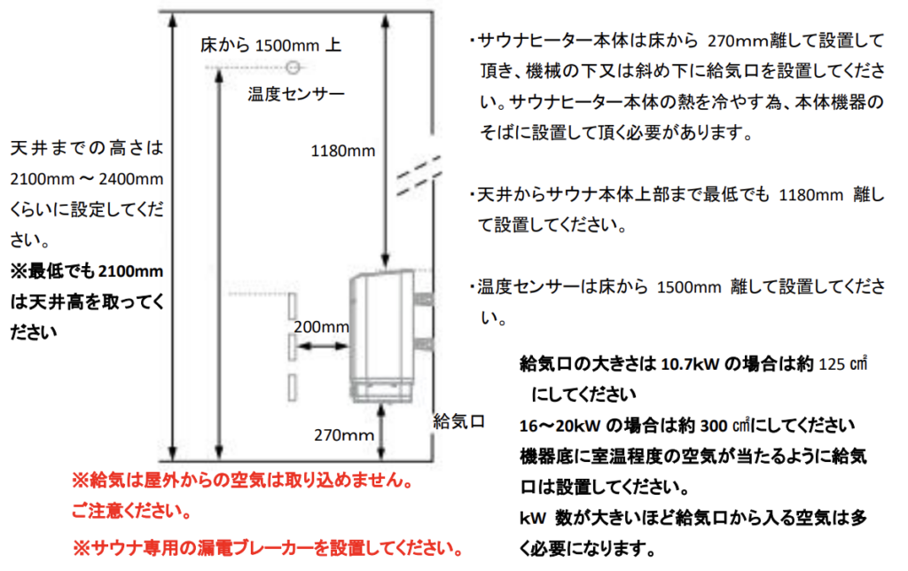- サウナ本体は左右側面、前方壁、ベンチから最低110mm 離して設置してください。