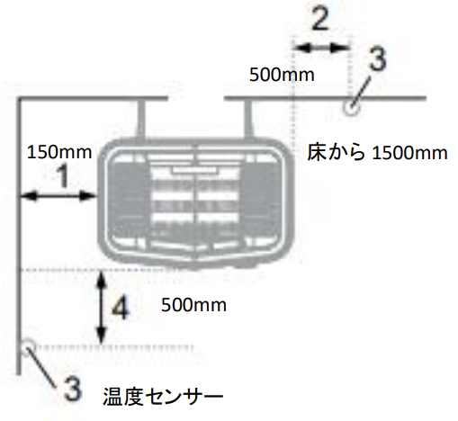 - 温度センサーの位置は床から 150mm の位置に設置してください。