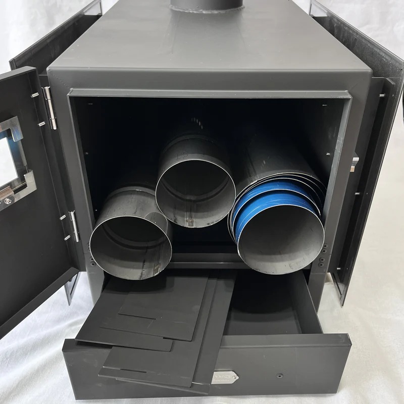 - 煙突の取り付け部の直径を88mmから108mmに広げ、ドラフト効果をアップ。